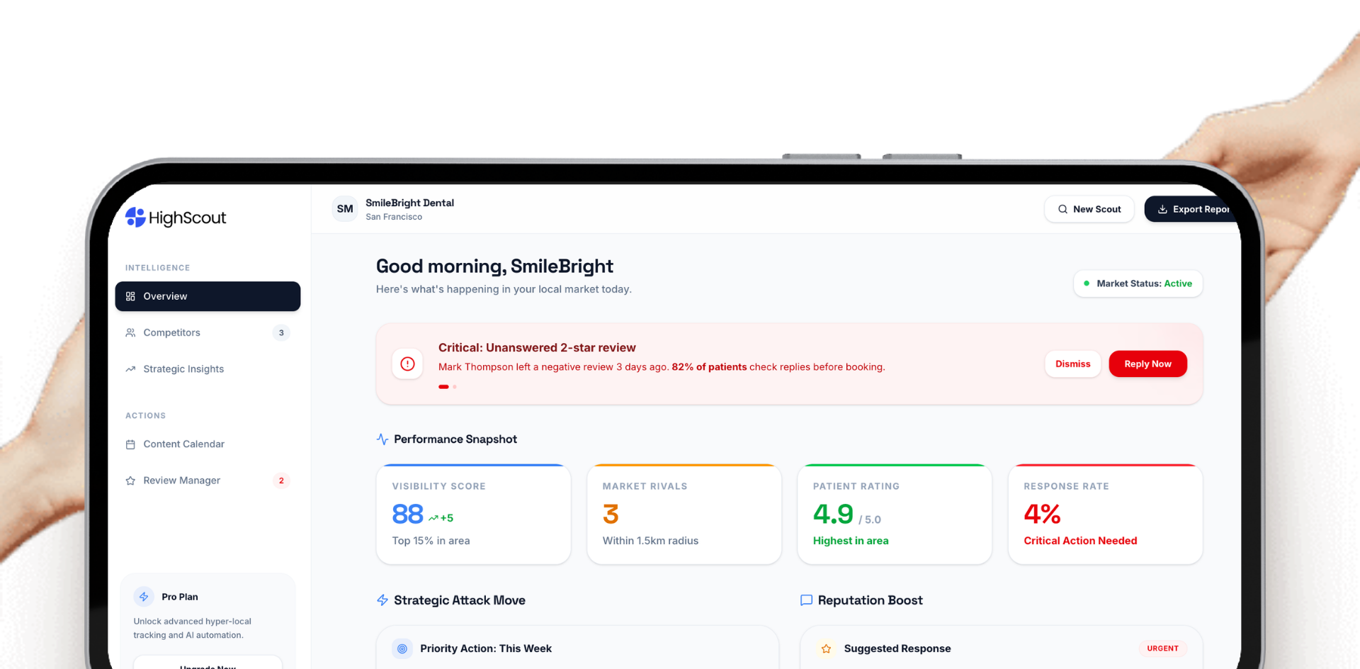 HighScout pulls live data from Google Maps, analyses your competitors, and delivers one clear action to take this week. No agency. No guesswork.